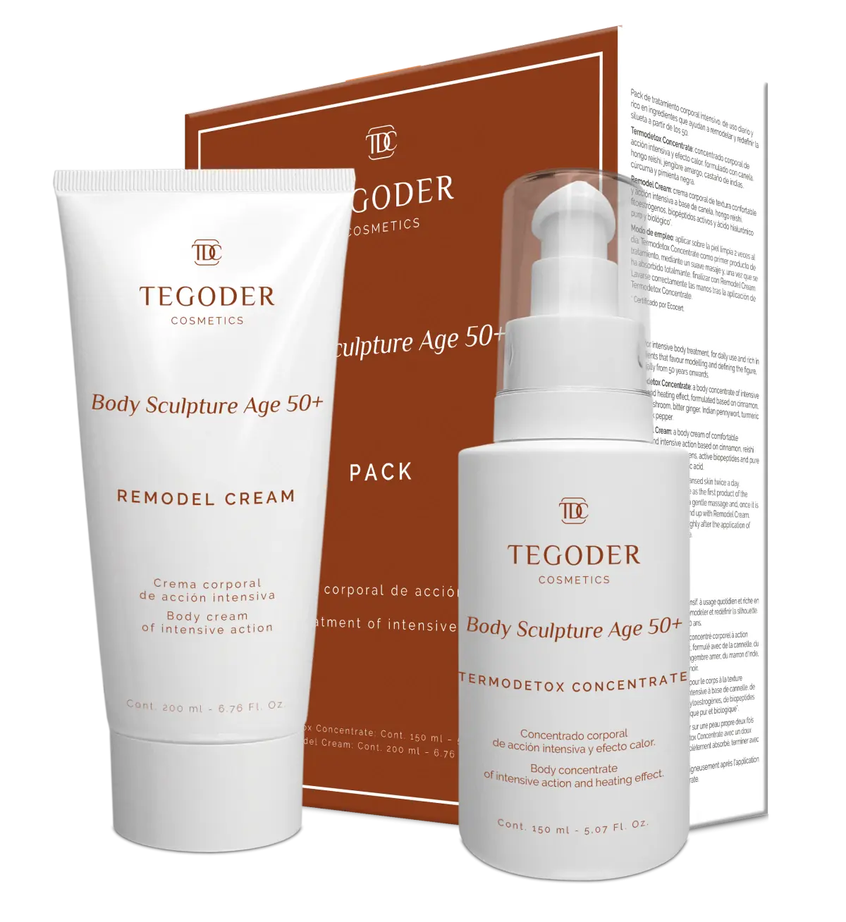 El Pack Body Sculpture Age 50+ de Tegoder combina Termodetox Concentrate y Remodel Cream para redefinir la silueta. Su fórmula con hongo reishi y factores de crecimiento compensa la pérdida de densidad, reafirmando los tejidos desde la primera aplicación.